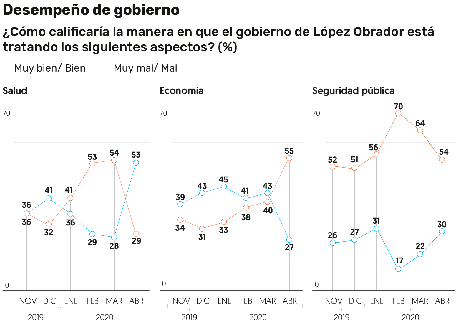 A pesar de ser el principal problema de México, la población considera que la estrategia sanitaria para mitigar el impacto del nuevo cornavirus, SARS-COV-2 ha sido efectiva, por lo que la calificación del Gobierno en este rubro alcanza el 53% de aprobación, no así la economía y la seguridad pública, que tiene índices bajos de aprobación en su tratamiento, 27% y 30% respectivamente.