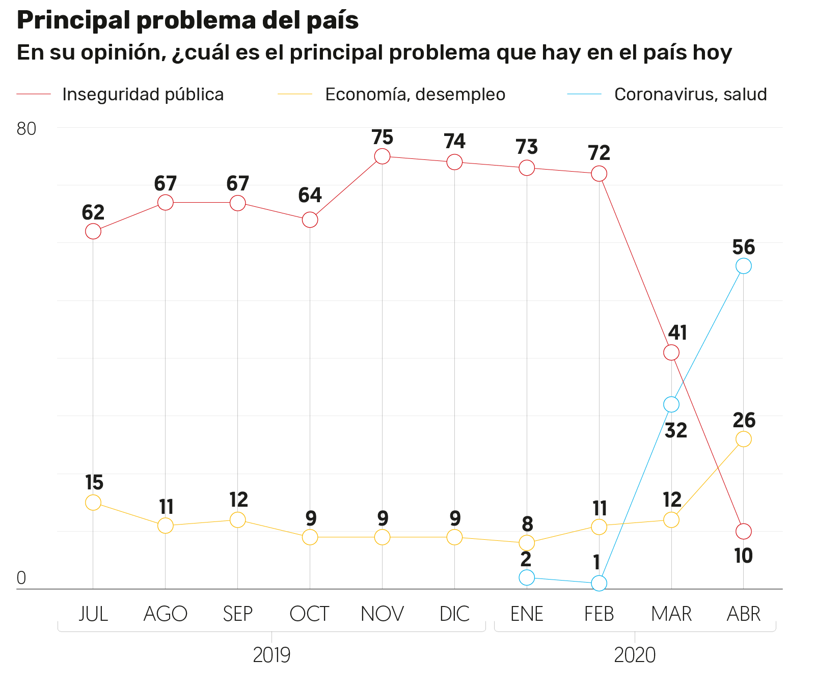 Para abril de este año, el Pueblo de México considera que la Salud, especialmente por el nuevo coronavirus, es el principal problema del país, con un 56%. Le siguen la Economía, con 26% y la Inseguridad con tan solo el 10%.