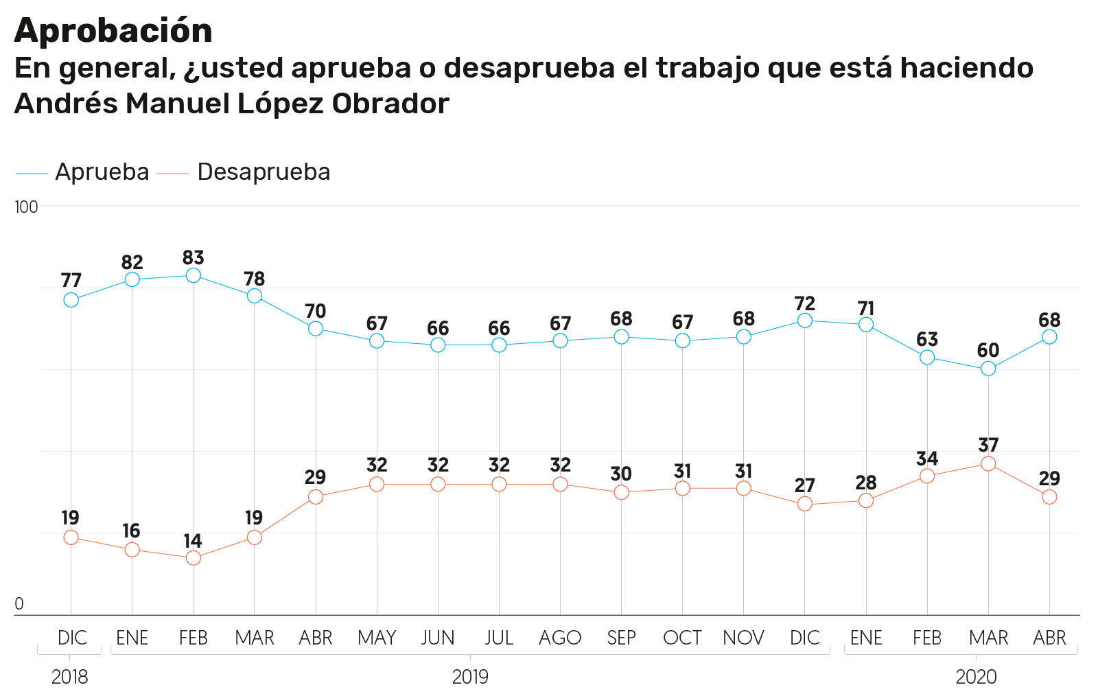 El buen manejo de la emergencia sanitaria que vive México tras la llegada del COVID19 ha impactado favorablemente en la popularidad del Presidente López Obrador. La encuesta mensual de El Financiero da cuenta de ello: de marzo a abril de este año, el índice de aprobación del mandatario subió 8 puntos porcentuales, de 60% a 68%.