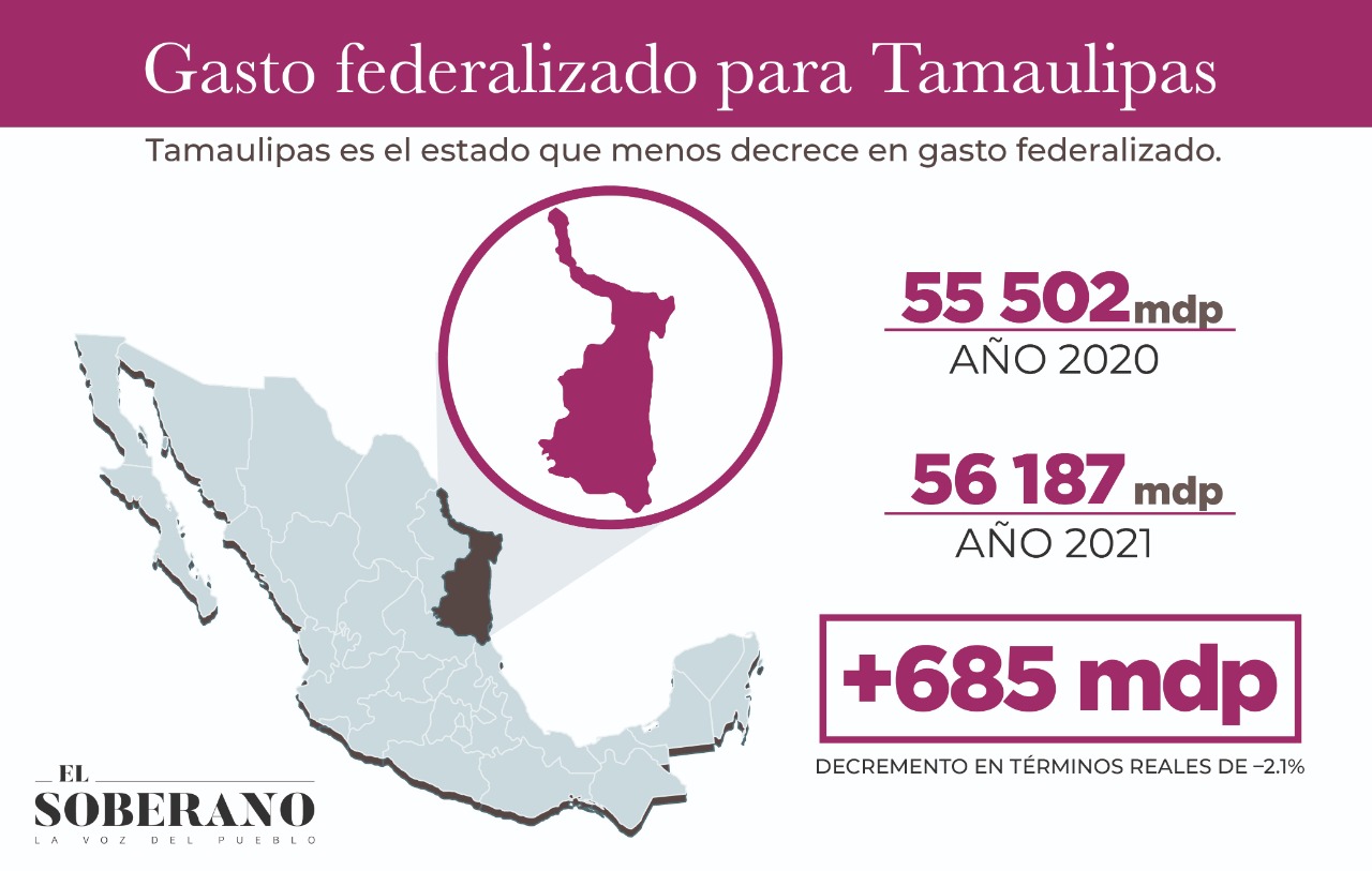 En 2020, la Cámara de Diputados aprobó, en lo que corresponde al gasto federalizado para Tamaulipas, un total de 55 mil 502 millones de pesos; mientras que, para el 2021 la Cámara Baja aprobó la asignación de 56 mil 187 millones de pesos, es decir, 685 millones más de lo otorgado el año anterior.