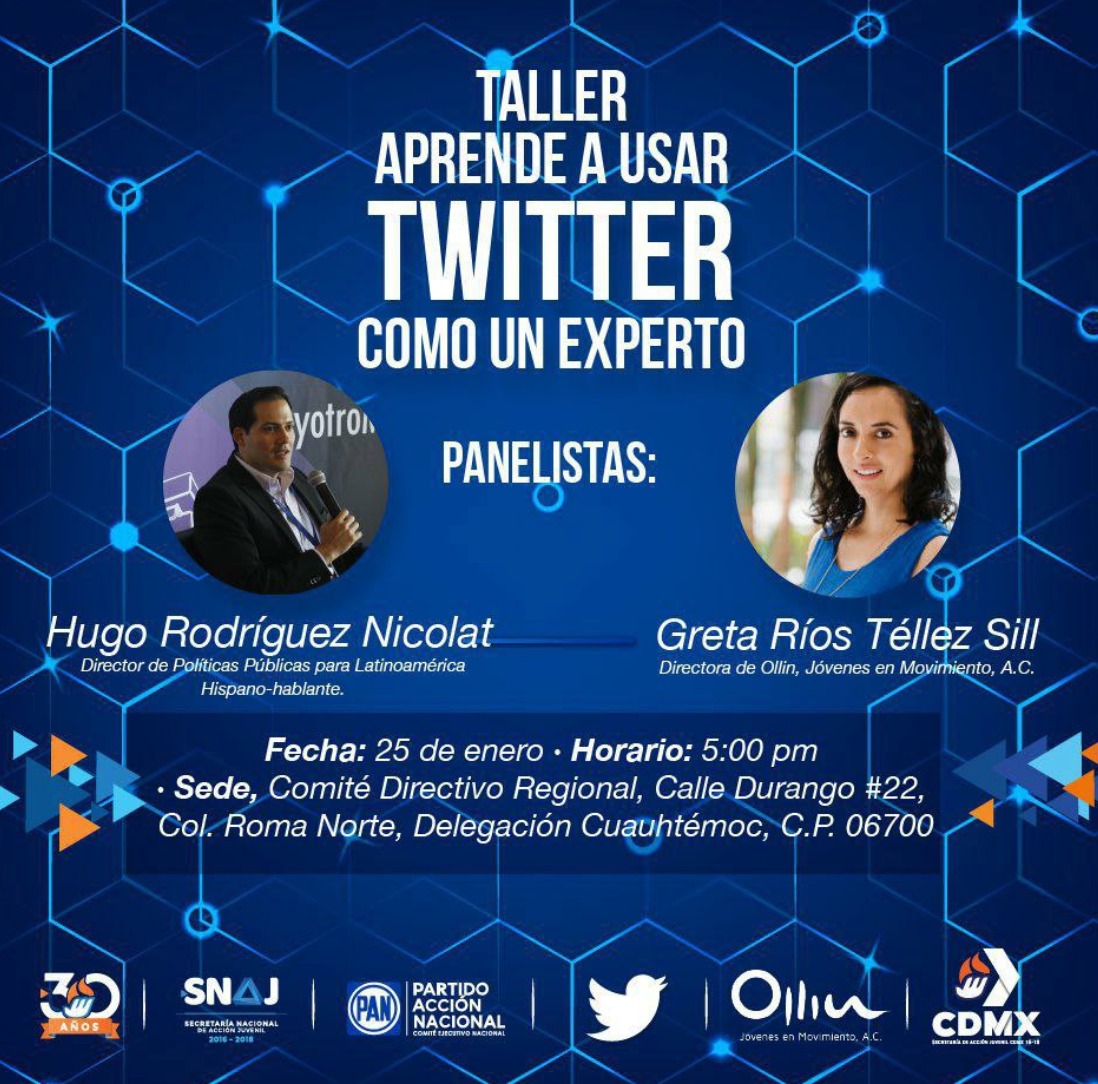 En este sentido, el periodista Álvaro Delgado también evidenció la cercanía del directivo de Twitter México con el Partido Acción Nacional, pues a través de su cuenta en la misma red social señaló que Rodríguez fue asesor del partido, como se muestra en una publicación de Acción Juvenil en la que agradecen a Hugo Rodríguez su impartición del taller “Usar Twitter como un experto”.