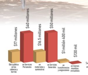Mientras que en Servicios Generales destina aproximadamente 50 millones de pesos, en transferencias y asignaciones un millón 400 mil pesos y en bienes muebles, inmuebles, 130 mil pesos.