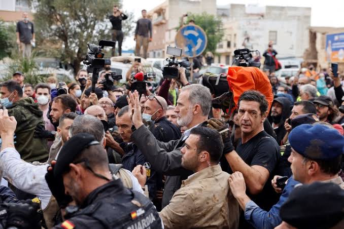 La escena en Paiporta parecía salida de una obra de teatro en la que la realeza perdía el guion. El rey de España, acompañado por el presidente del Gobierno, Pedro Sánchez, y el presidente de la Comunidad Valenciana, Carlos Mazón, se convirtió en el blanco de una furiosa protesta popular al llegar a la localidad. Al grito de “¡asesinos!” y con una lluvia de objetos y fango, la comitiva real y gubernamental fue recibida de una manera que recordaba más a un motín medieval que a una visita oficial.