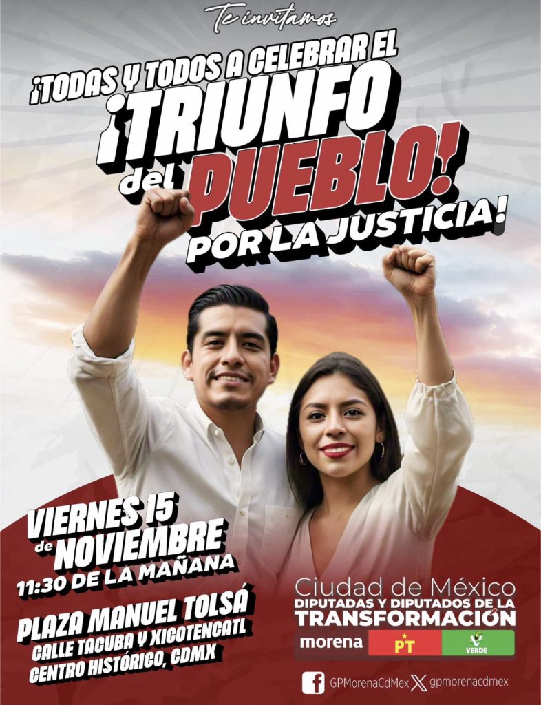 Morena ha convocado a un evento para celebrar la aprobación de las reformas al Poder Judicial, las cuales consideran un triunfo del pueblo. La cita será mañana, viernes 15 de noviembre, a las 11:30 horas, en la Plaza Tolsá, ubicada en Tacuba 8, en el Centro Histórico de la Ciudad de México, en la alcaldía […]