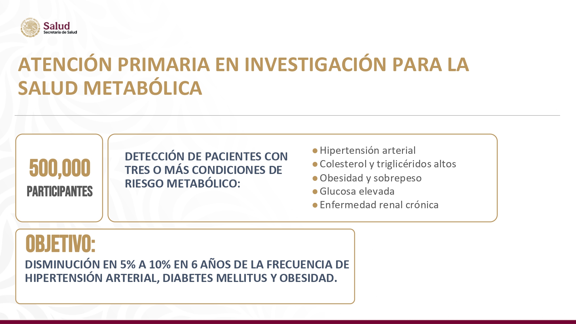 Se puso en marcha un programa integral con la participación de 500,000 personas para disminuir entre un 5% y un 10% la frecuencia de hipertensión arterial, diabetes y obesidad en seis años. Este esfuerzo se enfoca en detectar pacientes con tres o más condiciones de riesgo metabólico, como colesterol alto y enfermedades renales crónicas.