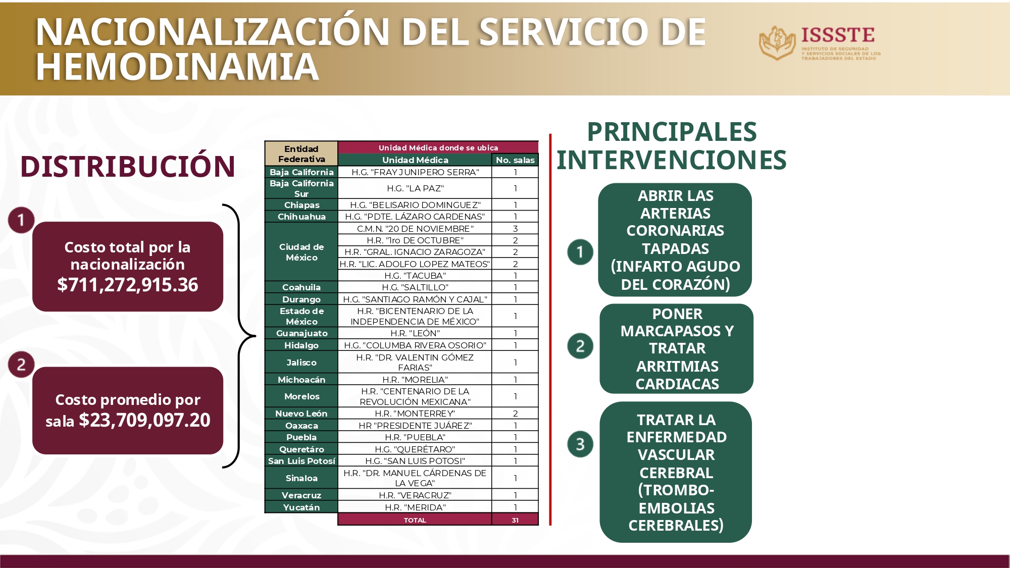 Con una inversión superior a 711 millones de pesos, el ISSSTE ha instalado 31 salas de hemodinamia en hospitales de todo el país para tratar emergencias cardiovasculares. De estas, seis están en pleno funcionamiento, y el resto avanza en sus etapas de instalación y equipamiento.