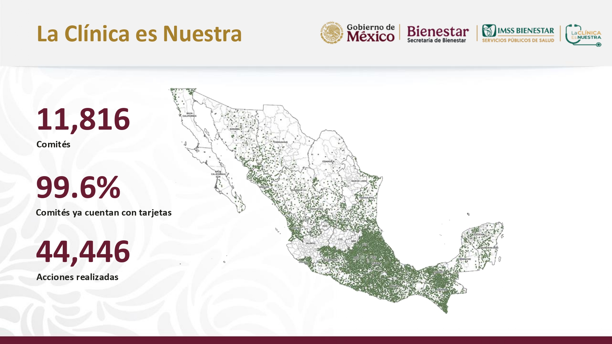 Se reporta la constitución del 99.6% de los comités de salud y la ejecución de 44,446 acciones enfocadas en infraestructura, equipamiento médico y mobiliario en unidades de primer nivel. Este programa busca garantizar atención médica digna en comunidades vulnerables.