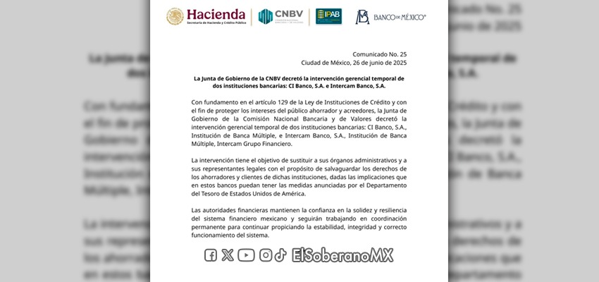 La Junta de Gobierno de la Comisión Nacional Bancaria y de Valores (CNBV) ordenó la intervención gerencial temporal de CI Banco e Intercam Banco, con fundamento en el artículo 129 de la Ley de Instituciones de Crédito. La Junta de Gobierno de la CNBV decretó la intervención gerencial temporal de dos instituciones bancarias: CI Banco, […]