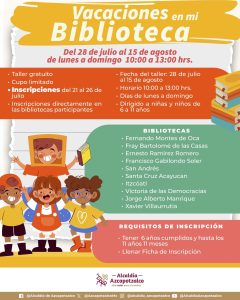 Las inscripciones para los cursos que se impartirán en los centros deportivos iniciarán el 16 de julio directamente en cada uno de estos espacios. Para las actividades en bibliotecas, el periodo de inscripción será del 21 al 26 de julio, mientras que para el curso del parque Calpulli, las inscripciones estarán abiertas del 22 al 24 de julio.