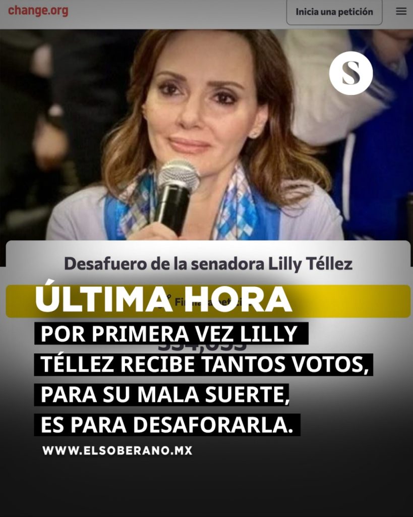 En Change.org más de 300 mil personas ya votaron por el desafuero de @lillytellezg , hartas de sus traiciones y ridículos.