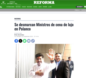 La Presidenta Claudia Sheinbaum Pardo arremetió contra el diario Reforma por difundir lo que calificó como una “falsedad absoluta”: la supuesta cena de lujo de los nuevos ministros de la Suprema Corte de Justicia de la Nación (SCJN), encabezados por el ministro presidente Hugo Aguilar Ortiz, en un exclusivo restaurante de Polanco.