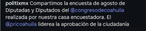En Coahuila, el PRI recurre a estrategias cada vez más desesperadas para maquillar su debilidad política. Hoy se denunció la existencia de Politxmx, una encuestadora falsa que carece de legitimidad y presencia pública: en Facebook no tiene seguidores y en Instagram apenas sigue a un reducido grupo de personajes vinculados al poder estatal:
