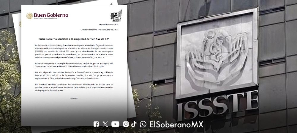 La Secretaría Anticorrupción y Buen Gobierno sancionó a la empresa Loeffler, S.A. de C.V. mediante el Órgano Interno de Control en el ISSSTE, imponiéndole una multa de 128 mil 255 pesos y una inhabilitación de tres meses para participar, por sí o mediante intermediarios, en contratos con el gobierno federal. La sanción se debe al […]