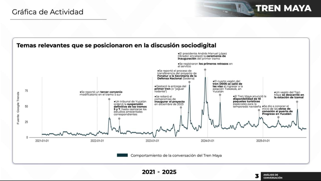 De acuerdo con los análisis de conversación digital (gráfica 1.0), los picos de actividad entre 2021 y 2025 no coinciden con los periodos de mayor impacto ambiental ni con hitos técnicos de la obra, sino con coyunturas mediáticas y políticas. De esta correlación se derivan las siguientes conclusiones: