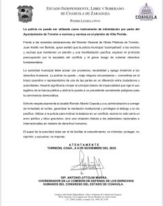 Ante las recientes declaraciones del Ayuntamiento de Torreón sobre la presencia policial para “acompañar” a los vecinos del fraccionamiento Villa Florida que mantienen un plantón en oposición a la ampliación del paso vehicular, el Diputado Antonio Attolini Murra, del grupo parlamentario de Morena, hizo un llamado a la autoridad municipal para resolver el conflicto por la vía del diálogo, la ley y la participación ciudadana, y no mediante la presencia de la fuerza pública.