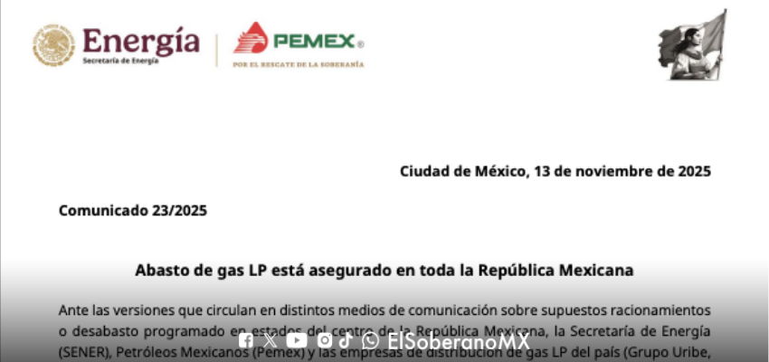 Ante versiones sobre supuestos racionamientos o desabasto de gas LP en estados del centro del país, la Secretaría de Energía (SENER), Petróleos Mexicanos (Pemex) y las principales empresas distribuidoras (Grupo Uribe, SoniGas, Combugas, Gas Express Nieto, Gas y Servicio, Gas Metropolitano, Hidrogas, Regio Gas, entre otras) aclararon que la información difundida no es correcta. Se […]