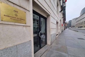 La concentración, programada para denunciar supuestas problemáticas sociales en México, quedó desierta durante horas. Las inmediaciones de la sede diplomática permanecieron vacías, sin presencia de jóvenes, pancartas o cualquier señal de movilización. Solo turistas y peatones cruzaron la zona bajo una fuerte lluvia.