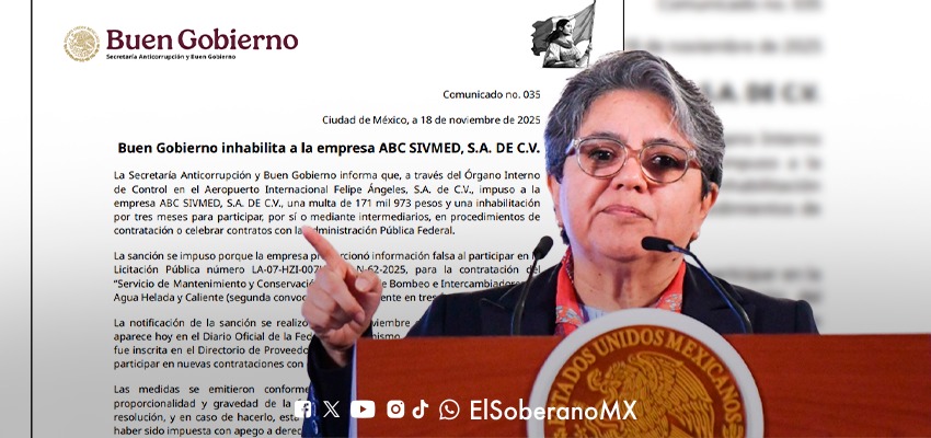 La Secretaría Anticorrupción y Buen Gobierno informa que, a través del Órgano Interno de Control en el Aeropuerto Internacional Felipe Ángeles, S.A. de C.V., impuso a la empresa ABC SIVMED, S.A. DE C.V., una multa de 171 mil 973 pesos y una inhabilitación por tres meses para participar, por sí o mediante intermediarios, en procedimientos de contratación o celebrar contratos con la Administración Pública Federal.