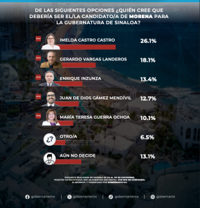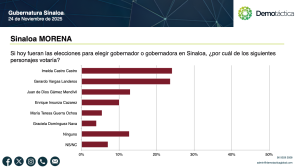 El estudio de Demotáctica, levantado el 24 de noviembre de 2025, confirma la tendencia ascendente de Imelda Castro. En la medición de preferencias internas por personaje, la senadora aparece nuevamente al frente, marcando 24.15% del respaldo, muy por encima de sus competidores más cercanos: Gerardo Vargas (12.74%), Enrique Inzunza (7.09%), María Teresa Guerra (10.02%) y Graciela Domínguez (3.95%).