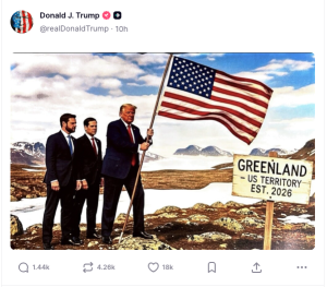 Las imágenes, que no incluyen advertencia alguna sobre su carácter ficticio, muestran mapas del continente americano teñidos con la bandera de Estados Unidos superpuesta sobre sus vecinos del norte y del sur, así como a Groenlandia, un territorio autónomo bajo soberanía danesa. En una de las piezas, Trump incluso aparece plantando la bandera estadounidense en Groenlandia junto a su vicepresidente y al secretario de Estado, con un letrero que proclama: “Greenland — U.S. Territory Est. 2026”.