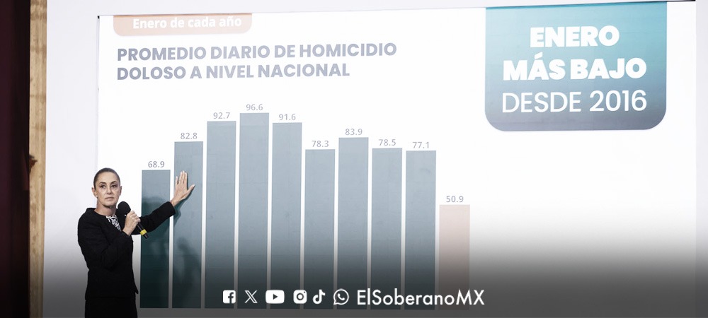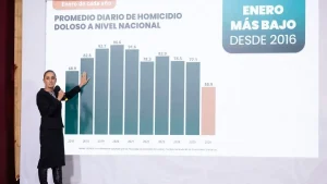 La Presidenta Claudia Sheinbaum Pardo informó que los homicidios dolosos disminuyeron 42% desde el inicio de su gobierno en octubre de 2024, lo que representa 36 asesinatos diarios menos en el país. Durante la conferencia, la mandataria destacó que estos resultados se deben a la consolidación de la Guardia Nacional, el fortalecimiento de la inteligencia, la coordinación con estados e instituciones federales y la atención a las causas de la violencia.