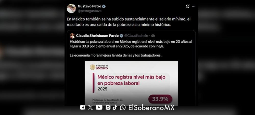 El Presidente de Colombia, Gustavo Petro, reconoció que el aumento sustancial del salario mínimo en México ha contribuido a una reducción histórica de la pobreza laboral, destacando el modelo social impulsado en el país. Señaló que los resultados demuestran que mejorar el ingreso de las y los trabajadores sí impacta directamente en su bienestar.