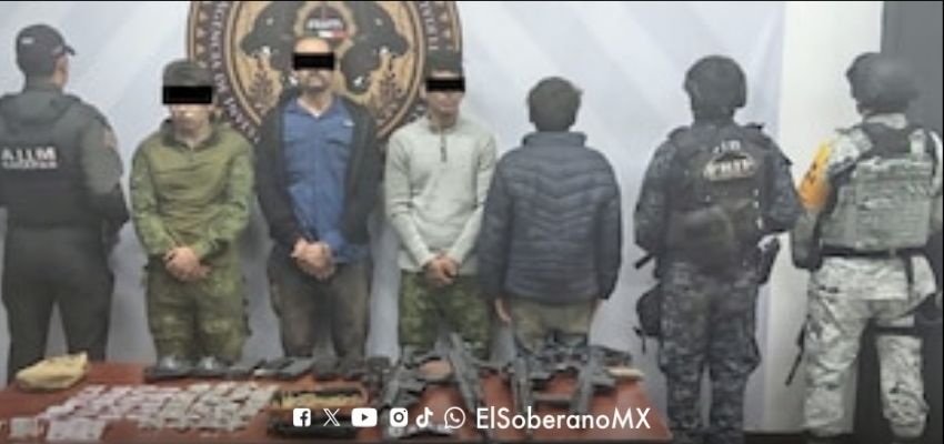 A los detenidos —identificados como Kevin “N”, Rafael “N”, José “N” y un joven menor de edad— se les aseguró un arsenal que incluía cuatro armas largas tipo AK-74 y M4, múltiples cargadores y cientos de cartuchos útiles de distintos calibres, así como droga con características de marihuana y cristal. También se les encontró equipo táctico, chalecos balísticos, coderas y un parche con las siglas del CJNG.