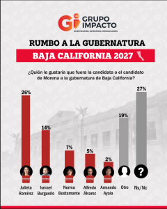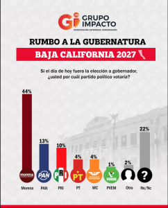 A poco más de un año del arranque formal del proceso electoral, los números comienzan a marcar tendencia en Baja California. De acuerdo con la encuesta realizada por Grupo Impacto, Morena lidera la intención de voto rumbo a la gubernatura de 2027 con un sólido 44%, muy por encima del PAN (13%) y el PRI (4%). En un escenario donde el movimiento guinda mantiene amplia ventaja, el perfil que más crece y más entusiasma dentro del partido es el de Julieta Ramírez.