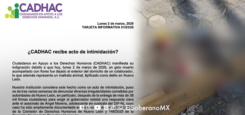 La organización Ciudadanos en Apoyo a los Derechos Humanos (CADHAC) manifestó su indignación luego de que este lunes 2 de marzo de 2026 fuera dejado un gato muerto, acompañado con flores, al exterior del domicilio de uno de sus colaboradores, en Nuevo León. El hecho, además de constituir un presunto acto de intimidación, representa maltrato animal, delito tipificado en la entidad.
