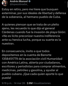 “Estoy en retiro, pero me hiere que busquen exterminar, por sus ideales de libertad y defensa de la soberanía, al hermano pueblo de Cuba”, expresó López Obrador en su publicación. En ese contexto, convocó a la ciudadanía a participar en una colecta para apoyar a la población cubana en medio de las dificultades para acceder a combustibles, alimentos y medicinas.