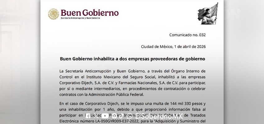 En el caso de Corporativo Dijech, se le impuso una multa de 144 mil 330 pesos y una inhabilitación por 1 año, debido a que proporcionó información falsa al participar en la Licitación Pública Internacional Bajo la Cobertura de Tratados Electrónica número LA-050GYR009-E37-2022, para la “Adquisición y Suministro del Grupo 379 Consumibles de Equipo Médico, para el ejercicio 2022”; consistente en una constancia de situación fiscal, supuestamente emitida por el Instituto del Fondo Nacional de la Vivienda para los Trabajadores. La notificación de la sanción fue realizada el 11 de marzo de 2026.