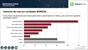 La gubernatura de Colima en 2027 apunta a ser terreno fértil para Morena, de acuerdo con la más reciente encuesta de Demotáctica Global Research, levantada entre el 8 y el 13 de abril de 2026 con una muestra de mil 200 personas y un margen de error de +/- 2.93 puntos porcentuales.