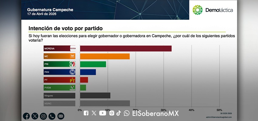 En Campeche, Morena también se posiciona en primer lugar con 32.87% de la intención de voto .