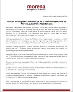 En un mensaje dirigido a la militancia, Alcalde expresó sentirse “sumamente honrada” por la encomienda y subrayó que en el movimiento “no se está por los cargos, sino por los encargos”, destacando su compromiso de seguir aportando a la transformación del país desde esta nueva responsabilidad.