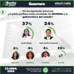 Beatriz Mojica Morga se consolida como la figura política con mayor proyección electoral en Guerrero de cara a los comicios de 2027. Así lo revela la encuesta Rumbo 2027 de la firma Electoralia, levantada entre el 18 y 22 de abril de 2026 con 2,500 entrevistas, un nivel de confianza estadística del 95% y un margen de error de ±1.96%.