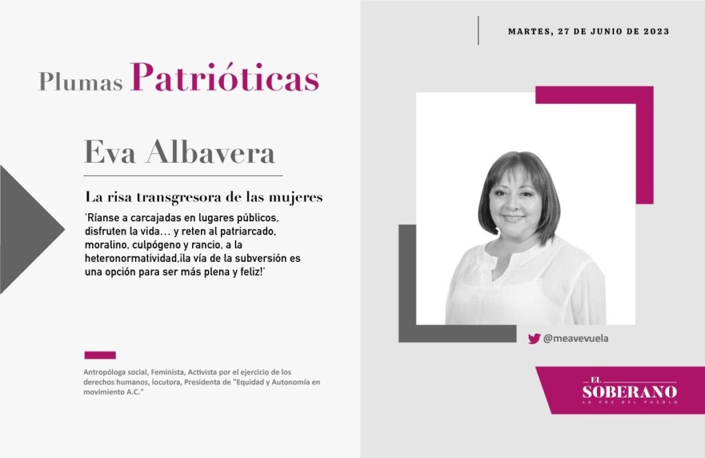 Entonces, la reivindicación de la risa de las mujeres es transgresora porque significa tomar (o retomar) el poder del cuerpo para goce, placer, contacto y comunicación, en los años recientes las mujeres ya han iniciado con fuerza la reivindicación de reírse a carcajadas, porque es un derecho, el de la felicidad, que está en la tercera generación de los derechos humanos, ahora las mujeres ríen y hacen reír a otras mujeres y ocasionalmente a hombres, desde los diversos escenarios culturales, por ejemplo en el ejercicio de la comedia, ya han demostrado que se pueden reír de la vida bajo un enfoque femenino, retando los estereotipos de género, si tienen oportunidad asistan a eventos de comediantas, ríanse a carcajadas en lugares públicos, disfruten la vida… y reten al patriarcado, moralino, culpógeno y rancio, a la heteronormatividad, ¡la vía de la subversión es una opción para ser más plena y feliz!