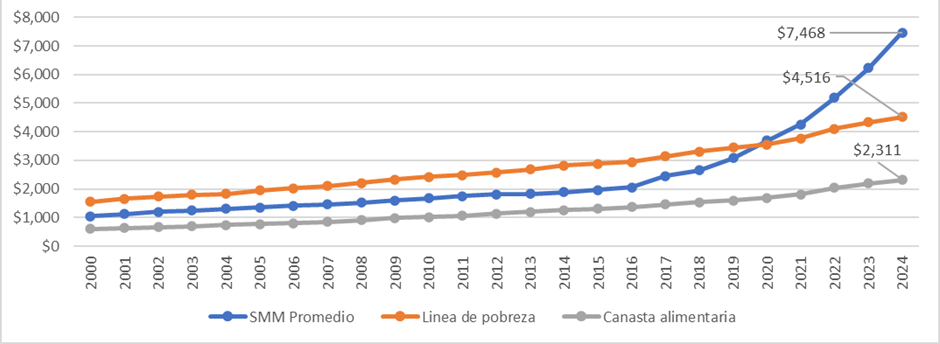 En las revisiones al salario mínimo, el Ejecutivo logró consensuar durante 2019 a 2024 aumentos de 16%, 20%, 15%, 22%, 20% y 20% respectivamente mientras que los aumentos en la inflación fueron de 2.83%, 3.15%, 7.36%, 7.82%, 4.66%, para 2024 ronda el 4%. Así, el aumento al salario mínimo ha crecido, descontando la inflación, alrededor de 120%. Es de destacar que desde mediados de la década de los años ochenta el salario mínimo no lograba superar la línea de pobreza. Como puede verse en la gráfica, fue hasta el 2020 que el salario mínimo fue suficiente para cubrir las necesidades básicas.