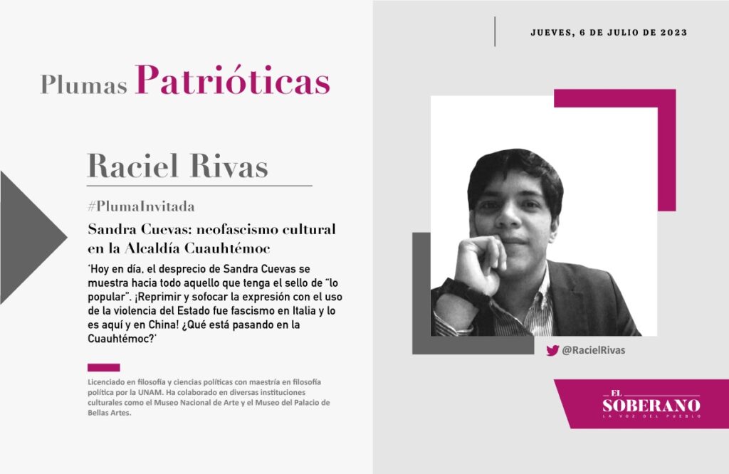 El fascismo en Italia, entre sus muchas características, se fue construyendo al extinguir y despreciar toda forma de representación social a través del arte previo a su ideología, o bien todo aquello considerado “comunista”. Hoy en día, el desprecio de Sandra Cuevas se muestra hacia todo aquello que tenga el sello de “lo popular”. ¡Reprimir y sofocar la expresión con el uso de la violencia del Estado fue fascismo en Italia y lo es aquí y en China! ¿Qué está pasando en la Cuauhtémoc? ¿Vivimos un neofascismo del cuál no terminamos de darnos cuenta? Recordemos la frase, tan atinada para estos momentos, de Albert Camus: “Toda forma de desprecio, si interviene en política, prepara o instaura al fascismo”