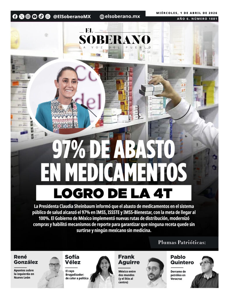 La Presidenta Claudia Sheinbaum informó que el abasto de medicamentos en el sistema público de salud alcanzó el 97% en IMSS, ISSSTE y IMSS‑Bienestar, con la meta de llegar al 100%. El Gobierno de México implementó nuevas rutas de distribución, modernizó compras y habilitó mecanismos de reporte para garantizar que ninguna receta quede sin surtirse y ningún mexicano sin medicina.