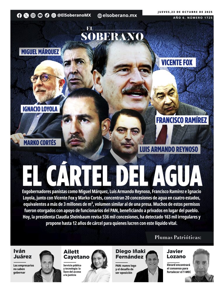 Exgobernadores panistas como Miguel Márquez, Luis Armando Reynoso, Francisco Ramírez e Ignacio Loyola, junto con Vicente Fox Quesada y Marko Cortés, concentran 20 concesiones de agua en cuatro estados, equivalentes a más de 3 millones de m³, volumen similar al de una presa. Muchos de estos permisos fueron otorgados con apoyo de funcionarios del #PAN, beneficiando a privados en lugar del pueblo.